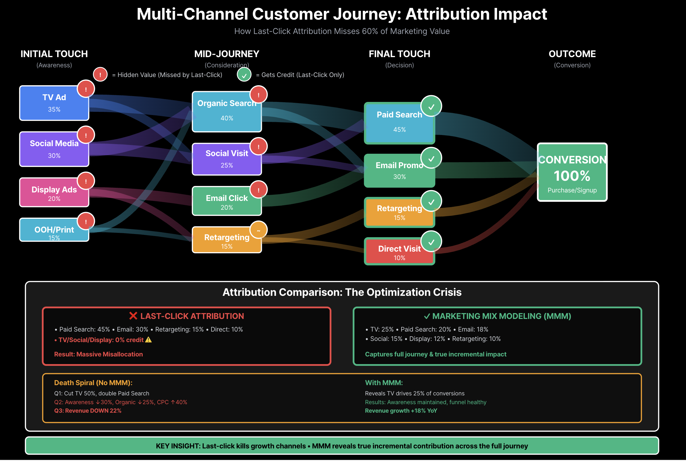 When you optimize based on last-click data, you unknowingly defund the awareness and consideration channels that fill the top of your funnel. Three months later, your "high-performing" bottom-funnel channels start struggling because there's no one left to convert.